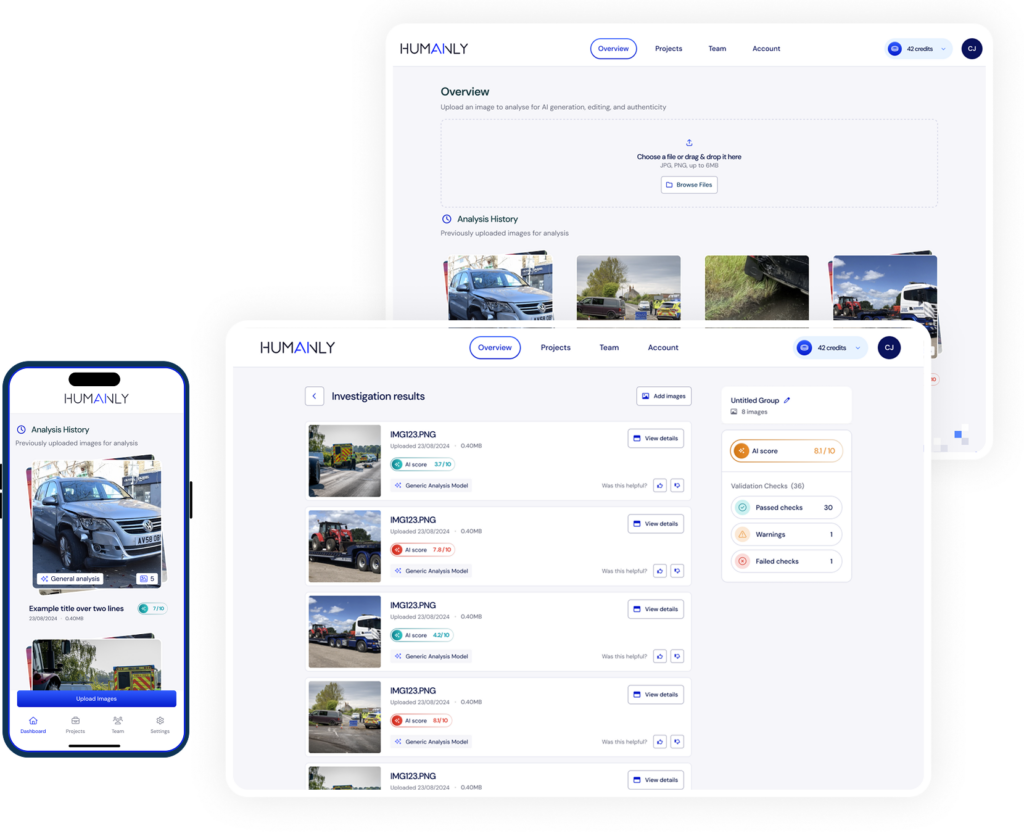 We protect your digital ecosystem and services by verifying authenticity, reducing fraud and claims risk, and supporting compliance in an AI driven world. Humanly provides an integrated authenticity layer that helps identify synthetic media within manual review workflows.